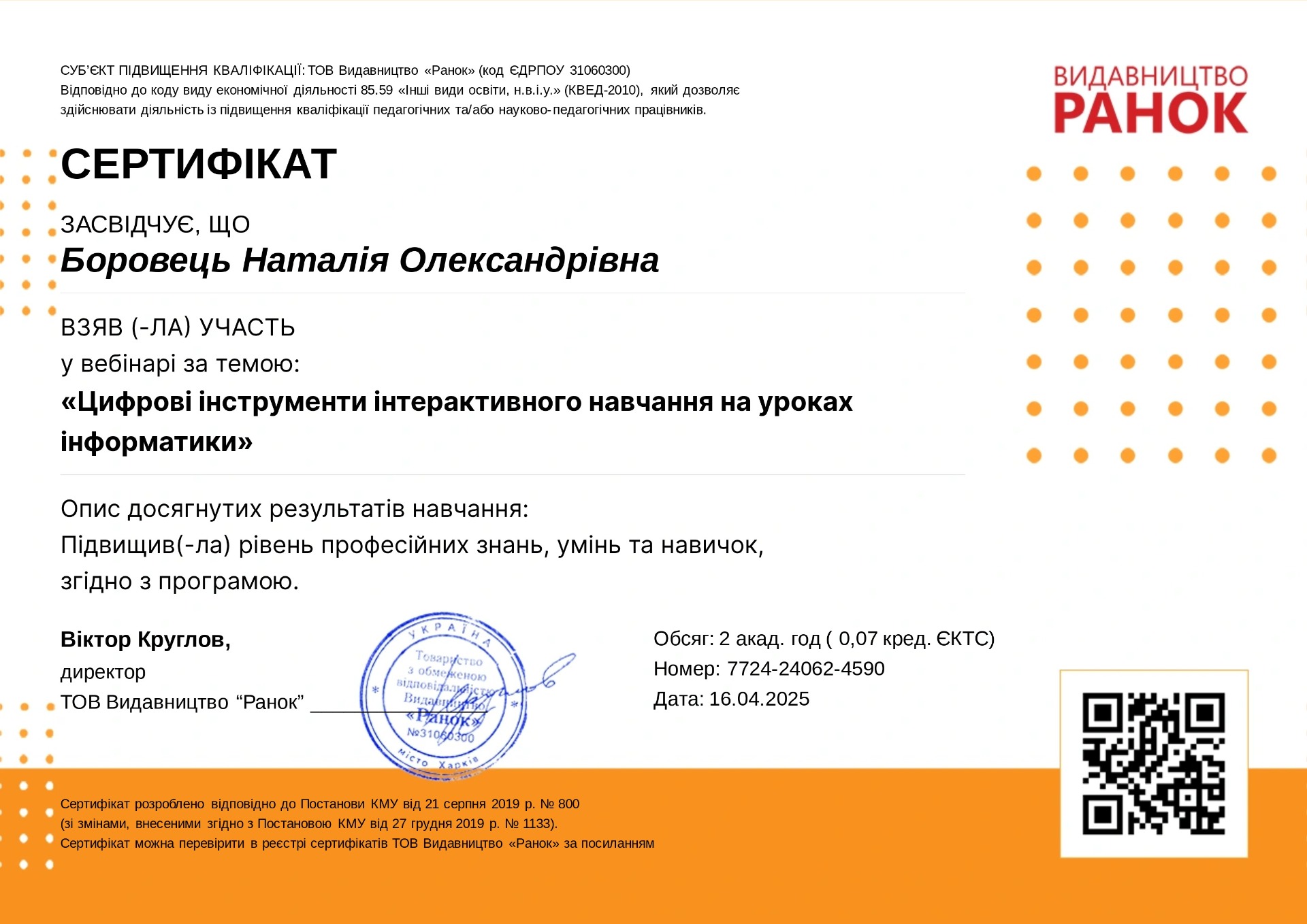 2024 рік - Напрям: психосоціальна підтримка та розвитрк стресостійкості учасників освітнього процесу. Присвоєно "Вчитель вищої категорії".